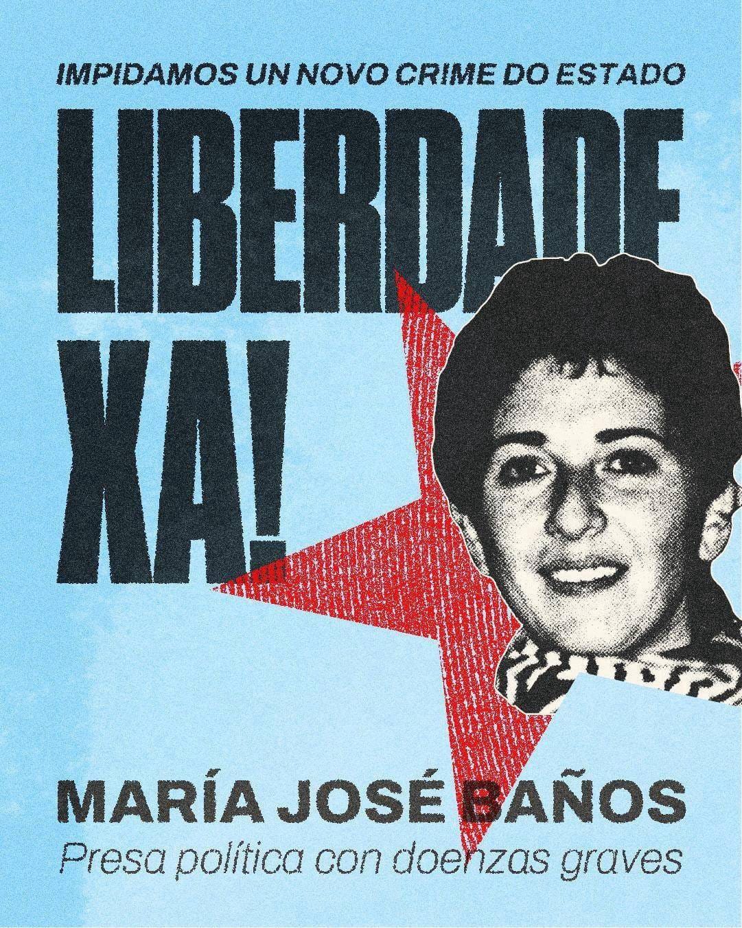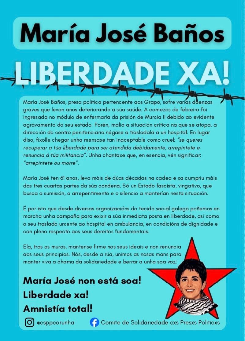 Desde esta red de solidaridad gallega –que no cuenta hasta este momento con el apoyo público de espacios vinculados a la socialdemocracia nacionalista galega – afirman que ponen en marcha una campaña para exigir la inmediata puesta en libertad de María José Baños, y añaden “ella, tras los muros, se mantiene firme en sus ideales, nosotros desde la calle unimos nuestras manos para mantener viva la llama de la solidaridad y gritar que Maria José no está sola”.
