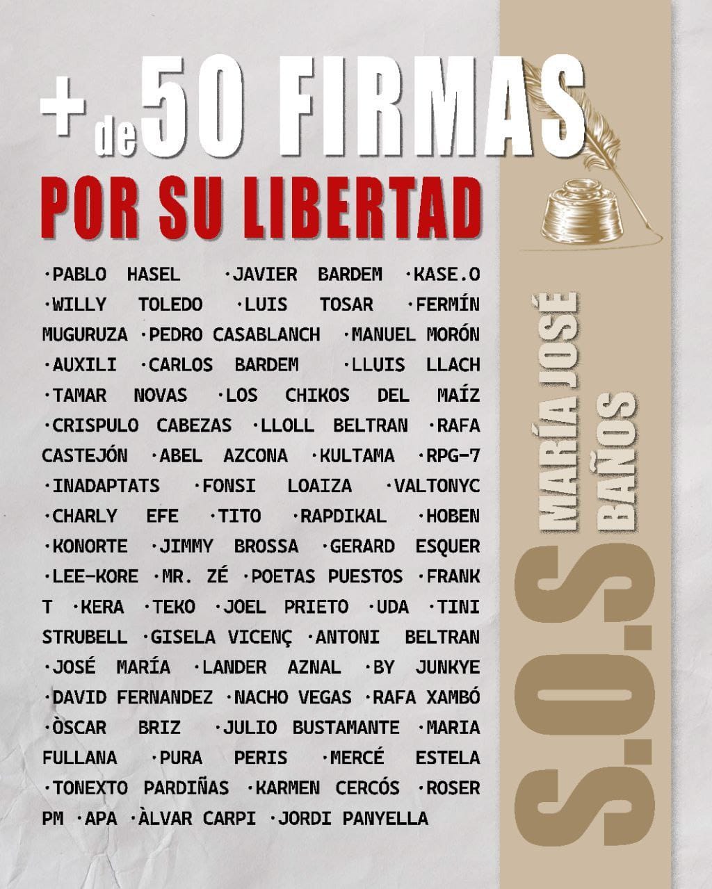 Más de medio centenar de artistas y personalidades de la cultura se han sumado este mismo martes a la solidaridad con María José Baños, firmando un manifiesto titulado Contra el exterminio de antifascistas, en el que exigen la inmediata atención médica en condiciones dignas y su puesta en libertad, recordando que la vida de la presa corre peligro. Entre los firmantes figuran el preso político y rapero Pablo Hasel; los actores Javier Bardem, Carlos Bardem, Luis Tosar y Willy Toledo; los músicos Kase.O, Nacho Vegas, Fermín Muguruza, Pedro Casablanc y Los Chikos del Maíz; así como decenas de artistas del ámbito musical y teatral.