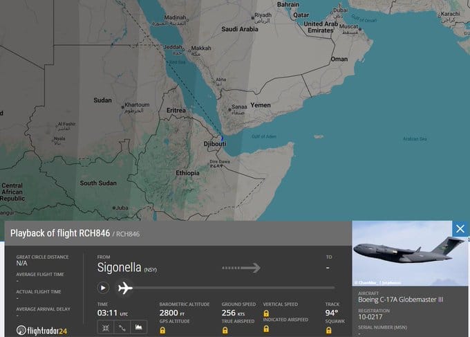 El C-17A Globemaster III que voló desde la base española a Sicilia sigue su ruta hasta el estratégico enclave militar en el Cuerno de África, situado frente a Yemen, mientras Moncloa insiste en que "no coopera con la guerra".
