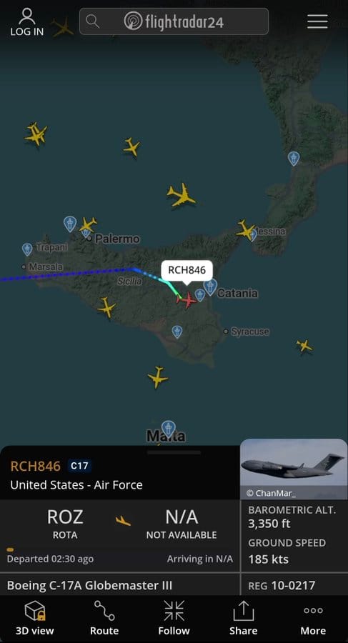El cruce de versiones se produce mientras un avión de transporte militar estadounidense C-17A Globemaster III, con matrícula 10-0217 y distintivo RCH846, despegaba en la tarde del miércoles desde la base naval de Rota (Cádiz, Andalucía), según los registros de la web de seguimiento aéreo Flightradar24 recogidos por usuarios en redes sociales. La aeronave, capaz de transportar tropas, vehículos pesados y hasta 77 toneladas de carga, puso rumbo al Mediterráneo oriental y aterrizó horas después en la base de Sigonella (Sicilia), un enclave estratégico que funciona como hub logístico principal de la Armada y la Fuerza Aérea de EE.UU. para operaciones en Oriente Medio y África. El seguimiento del vuelo sospechoso ha reavivado las preguntas sobre cuál está siendo el papel real de las instalaciones españolas en la logística de la guerra, más allá de las declaraciones oficiales.