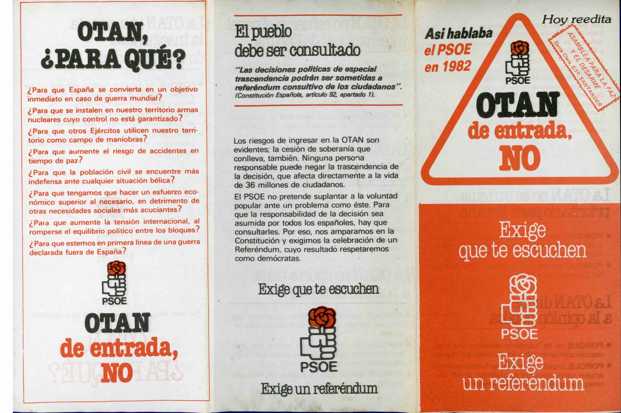 Felipe González había reclamado celebrar un referéndum “por respeto a la opinión pública” y llegó a afirmar que “del mismo modo que hemos dicho ‘de entrada, no’ estamos dispuestos a decir ‘de salida, sí’”, según recogen las octavillas del PSOE de 1982. En aquel material se sostenía, entre otras cosas, que “los riesgos de ingresar en la OTAN son evidentes; la cesión de soberanía que conlleva, también” y se exigía “la celebración de un Referéndum, cuyo resultado respetaremos como demócratas”.