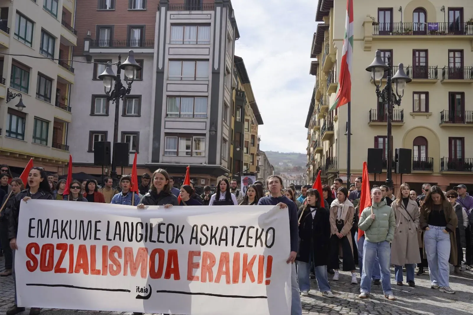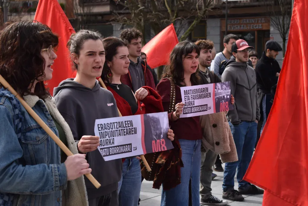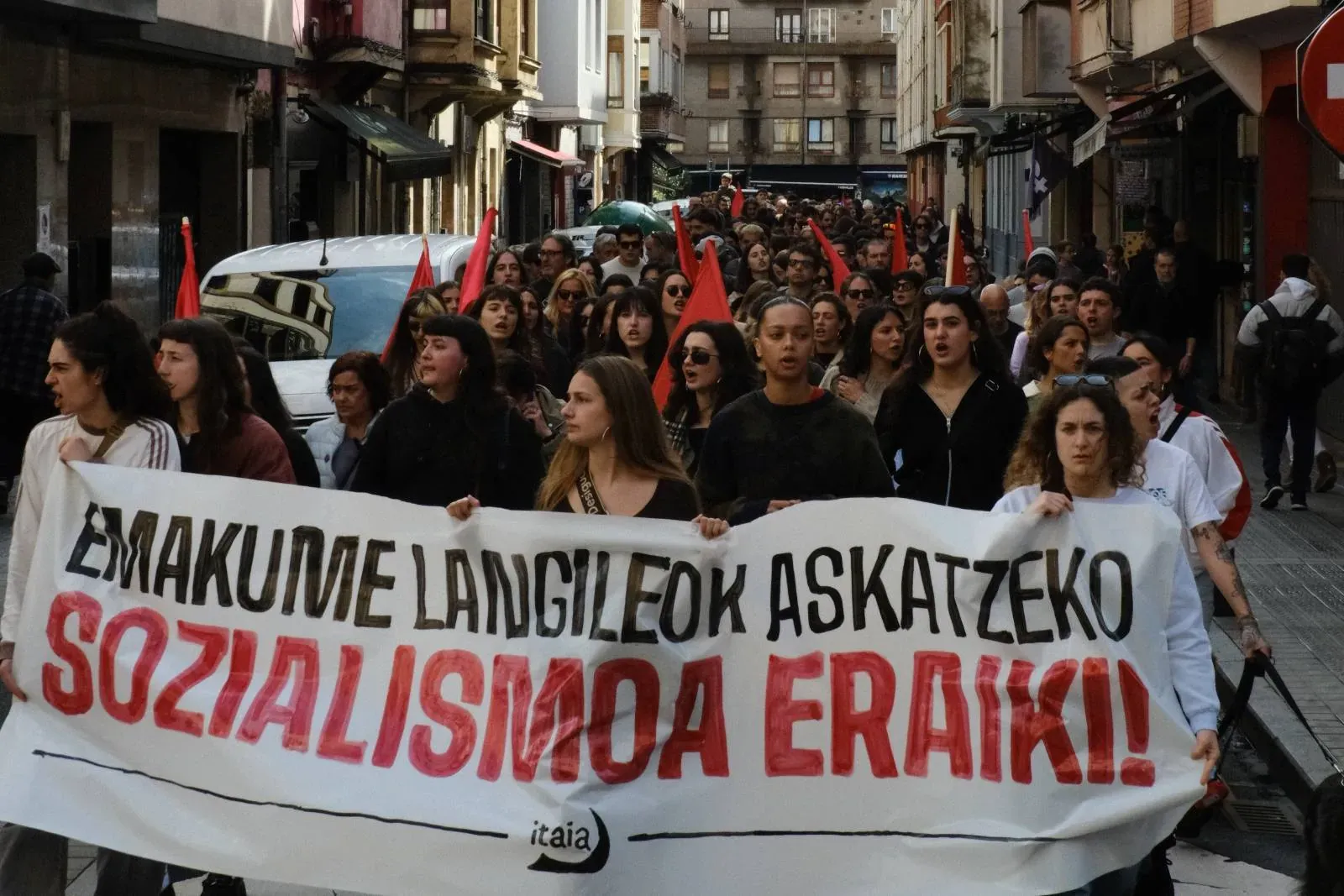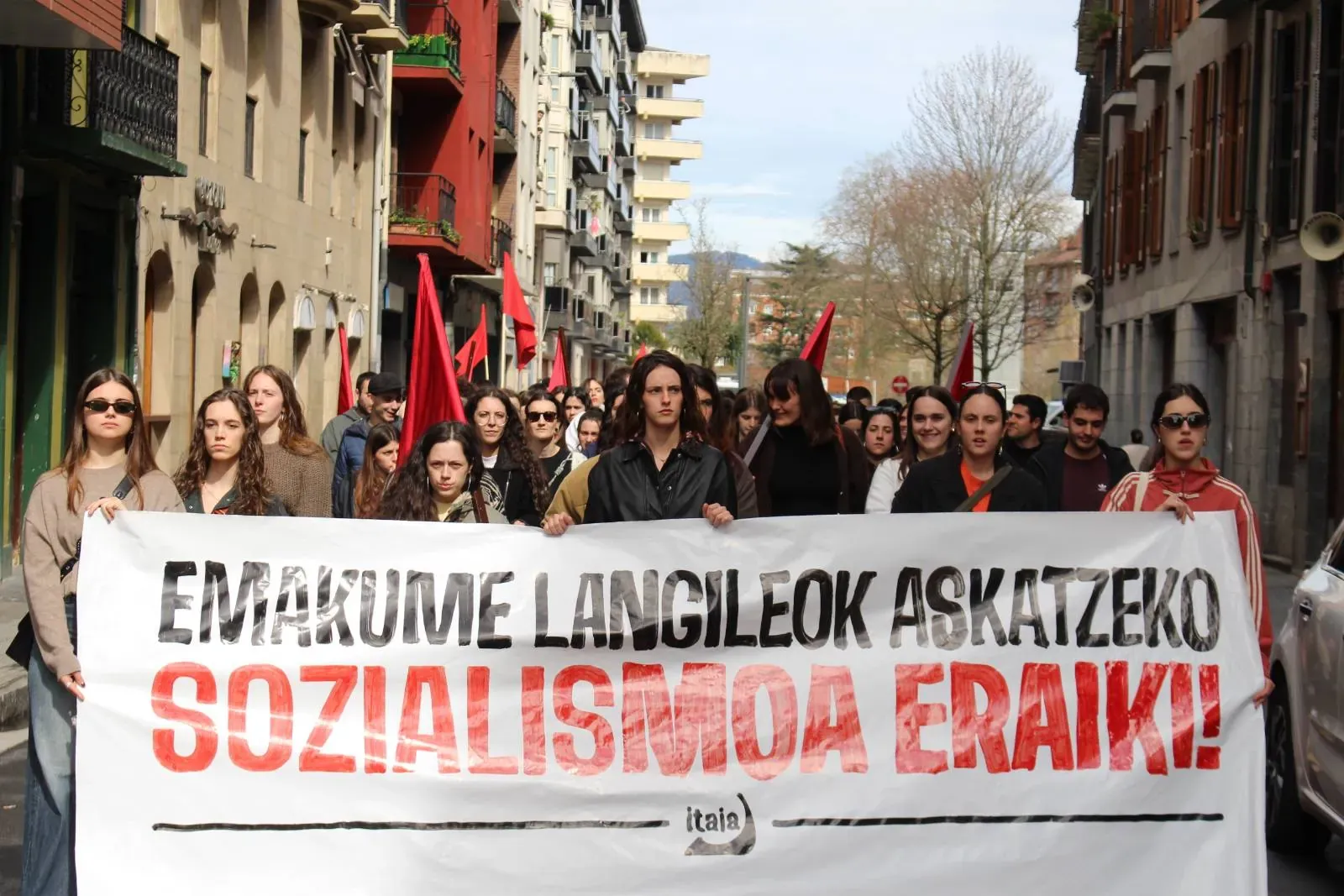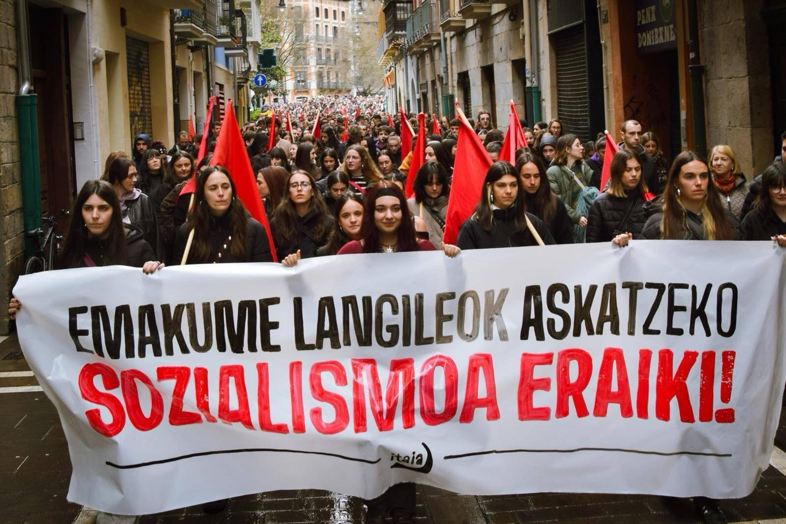 "El 8 de marzo se organizó por primera vez con el objetivo de contribuir a la defensa de los intereses de las mujeres trabajadoras e impulsar la lucha revolucionaria. Sin embargo, el carácter del día ha cambiado mucho desde entonces", explicaron desde Itaia al final de las manifestaciones. Denuncian que "el discurso a favor de la igualdad se ha convertido en una reivindicación vacía para garantizar los intereses económicos y electorales de la oligarquía, los empresarios y las instituciones", y que en ese discurso "se proclama la unidad de todas las mujeres", "cuando es evidente que existen intereses contrapuestos entre las mujeres". Y la Organización Socialista de Mujeres añade con contundencia: "Han obviado el carácter de clase de la opresión y han desfigurado la lucha. Sabemos que no hay igualdad en el capitalismo". Por lo tanto, subrayan que el 8 de marzo es "un día de lucha para señalar a los responsables de la opresión", y que también debe servir para "fortalecer la organización revolucionaria".
