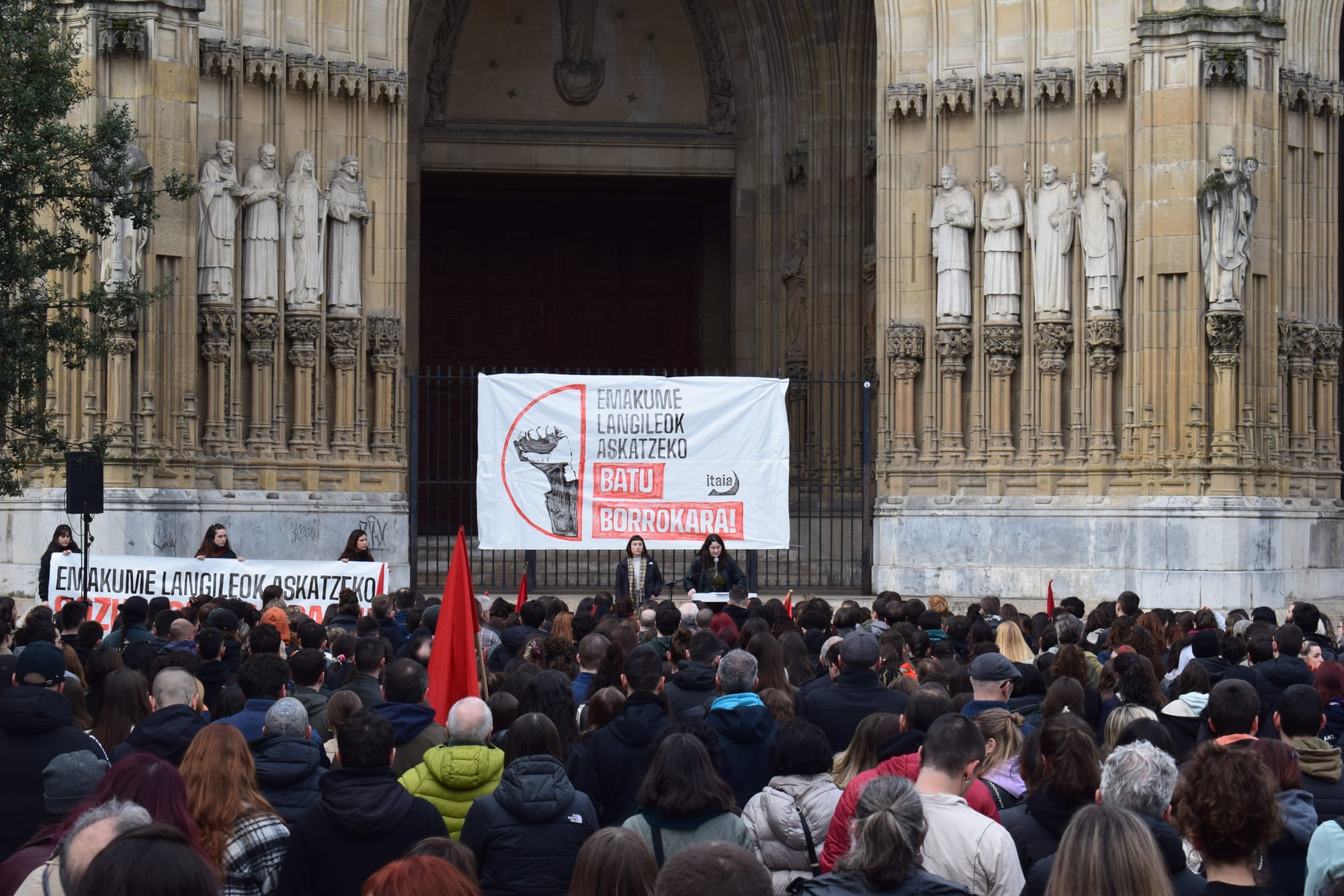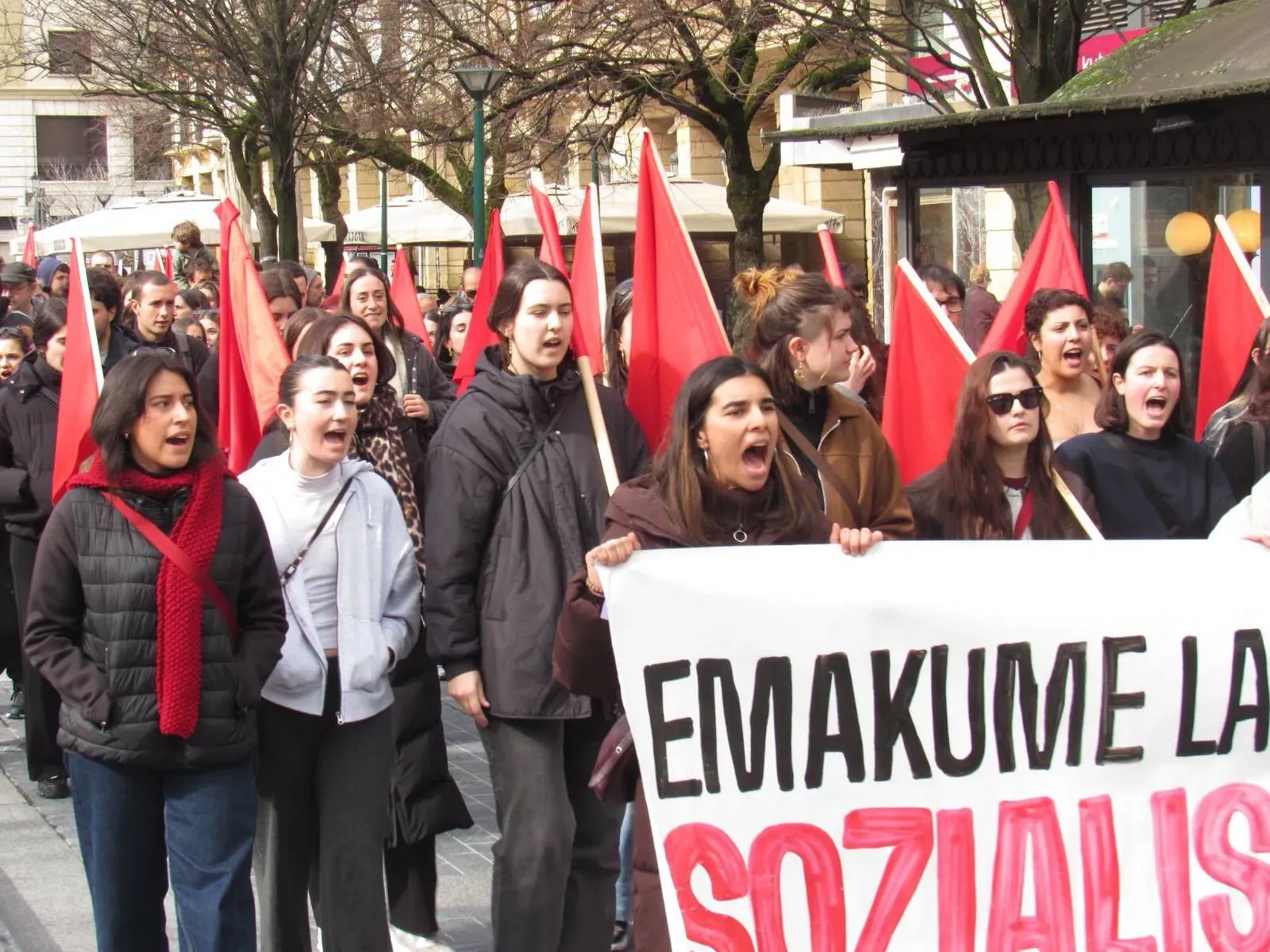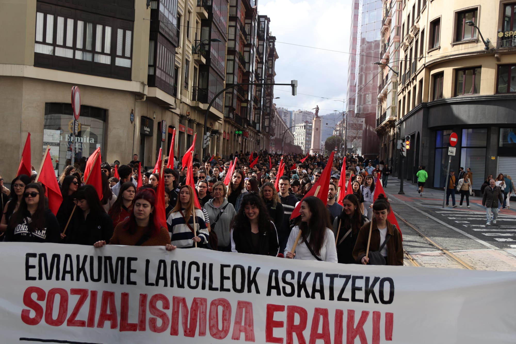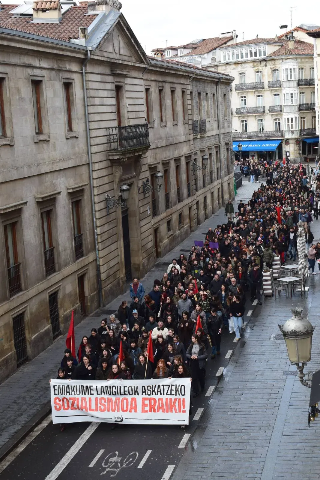 "El 8 de marzo se organizó por primera vez con el objetivo de contribuir a la defensa de los intereses de las mujeres trabajadoras e impulsar la lucha revolucionaria. Sin embargo, el carácter del día ha cambiado mucho desde entonces", explicaron desde Itaia al final de las manifestaciones. Denuncian que "el discurso a favor de la igualdad se ha convertido en una reivindicación vacía para garantizar los intereses económicos y electorales de la oligarquía, los empresarios y las instituciones", y que en ese discurso "se proclama la unidad de todas las mujeres", "cuando es evidente que existen intereses contrapuestos entre las mujeres". Y la Organización Socialista de Mujeres añade con contundencia: "Han obviado el carácter de clase de la opresión y han desfigurado la lucha. Sabemos que no hay igualdad en el capitalismo". Por lo tanto, subrayan que el 8 de marzo es "un día de lucha para señalar a los responsables de la opresión", y que también debe servir para "fortalecer la organización revolucionaria".