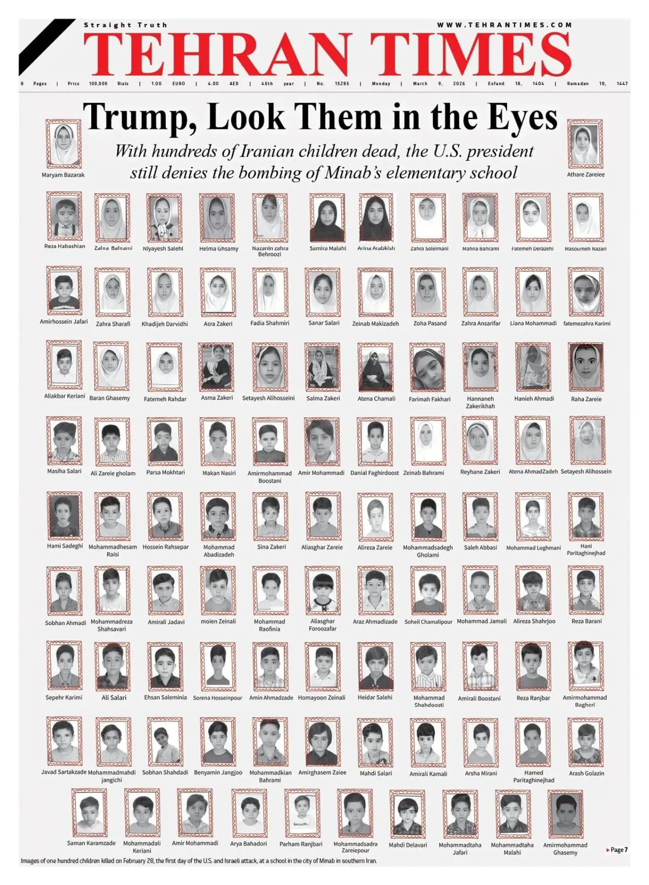 Mientras Trump asegura desde su avión que "están ganando la guerra por goleada", las familias de las más de 170 niñas asesinadas en Minab siguen enterrando a sus hijas. El diario Tehran Times lanza un desafío directo al presidente estadounidense: que mire a los ojos de los niños muertos cuyos cuerpos siguen siendo rescatados de entre los escombros. La verdad sobre quién mató a esas niñas, como la de tantas otras víctimas del "Eje agresor Epsteiniano", como se han referido en un comunicado conjunto de las misiones diplomáticas iraníes a la coalición entre EE.UU. e Israel, sigue enterrada bajo los escombros, pero las pruebas, al igual que las del caso Epstein, se acumulan a la vista del mundo: los niños representan ya el 30% de las víctimas mortales en Irán durante la primera semana de guerra.