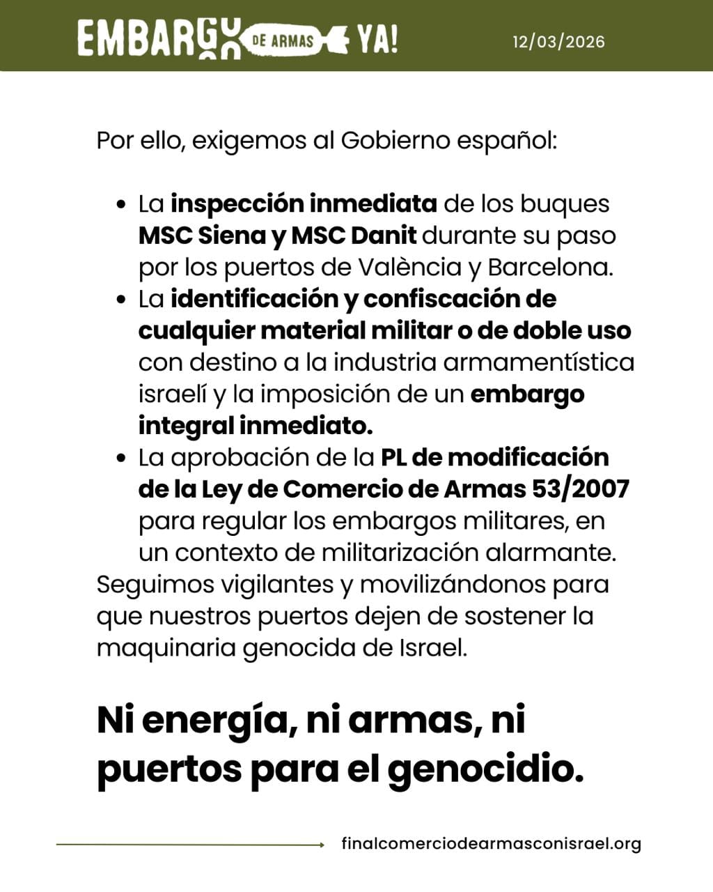 La modificación de la ruta del MSC Danit, por su parte, no implica que el cargamento haya dejado de ser una amenaza para el pueblo palestino, sino que simplemente se desvía a otro puerto europeo desde donde podría continuar su trayectoria hacia Israel. Las organizaciones hacen un llamamiento a los trabajadores portuarios y a la población para que mantengan la presión por el fin del comercio de armas con Israel. "Ningún puerto para el genocidio", concluyen.