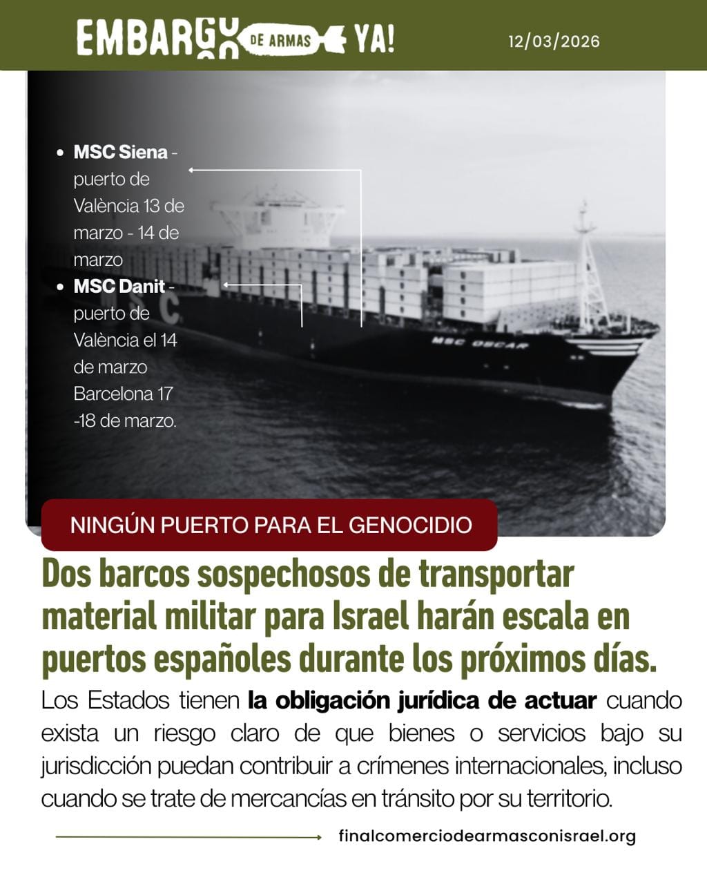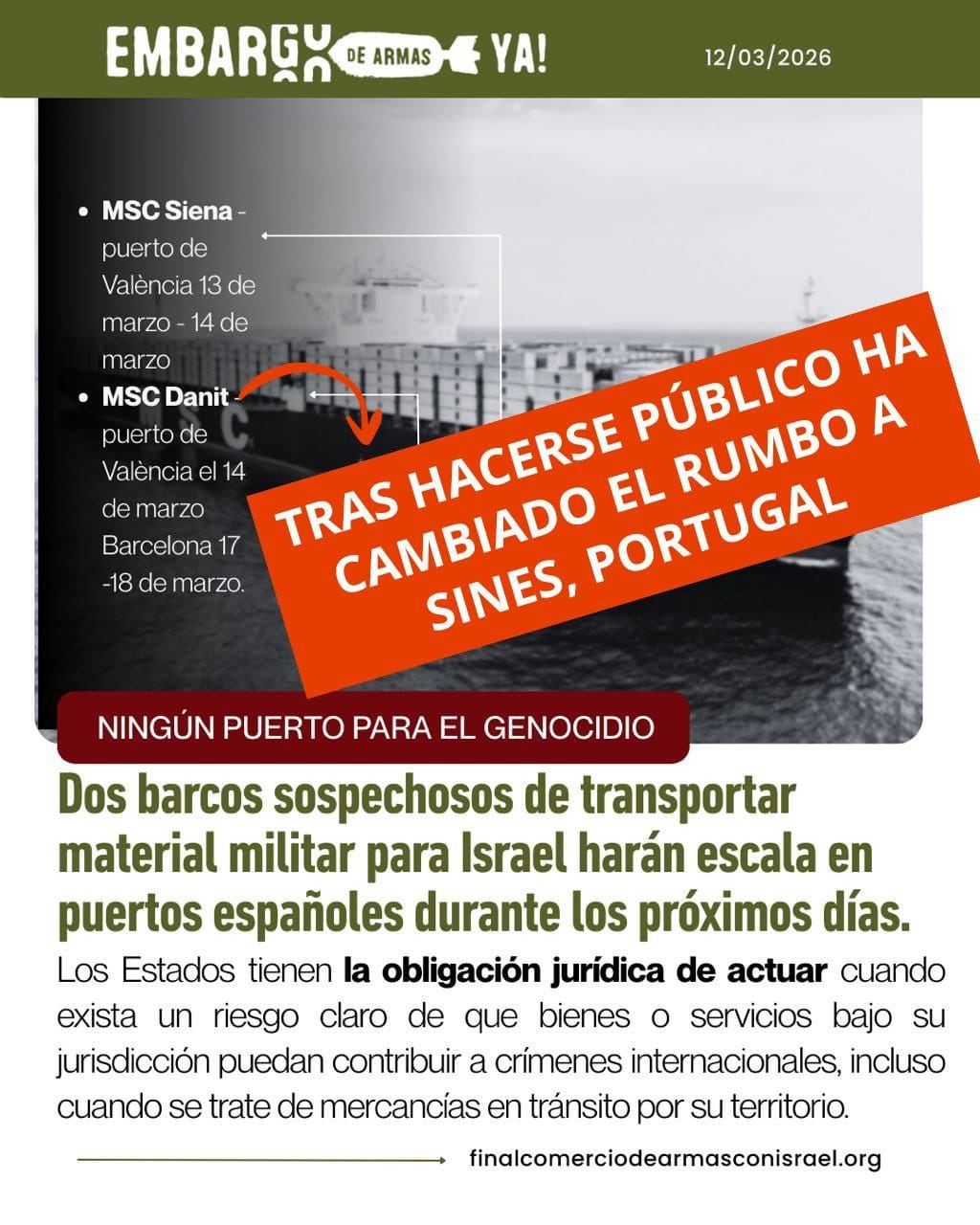 El cambio de rumbo evidencia que la presión social organizada surte más efecto que los "embargos" anunciados por el Gobierno español. Además, subraya la necesidad de mantener la vigilancia sobre el tráfico marítimo de armamento. Sin embargo, las organizaciones recuerdan que el otro buque de la misma cadena logística, el MSC Siena, mantiene su llegada prevista al puerto de València este viernes 13 de marzo. RESCOP exige al Gobierno español la inspección inmediata del MSC Siena durante su escala, así como la identificación y confiscación de cualquier material militar o de doble uso con destino a Israel. "Los Estados tienen la obligación jurídica de actuar cuando exista un riesgo claro de que bienes o servicios bajo su jurisdicción puedan contribuir a crímenes internacionales", recuerdan en su comunicado.