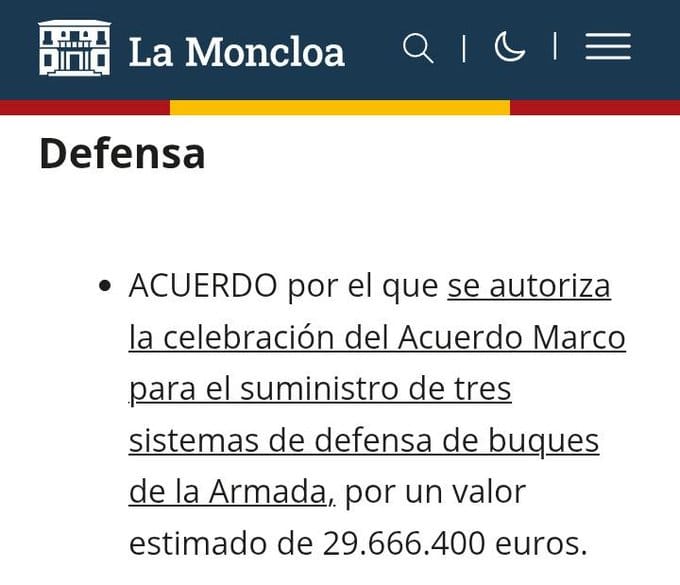 El Consejo de Ministros del Gobierno español ha autorizado esta semana la celebración de un acuerdo marco para el suministro de tres sistemas de defensa de buques de la Armada por un precio estimado de 29.666.400 euros, según consta en la referencia del Consejo publicada el pasado 17 de marzo. Los sistemas, según la nota oficial publicada en la web de La Moncloa, son “capaces de prevenir y frenar posibles amenazas de drones y sistemas lanzacohetes, garantizando una defensa eficaz tanto aérea como en superficie de nuestras tropas”.