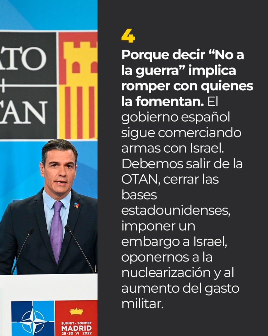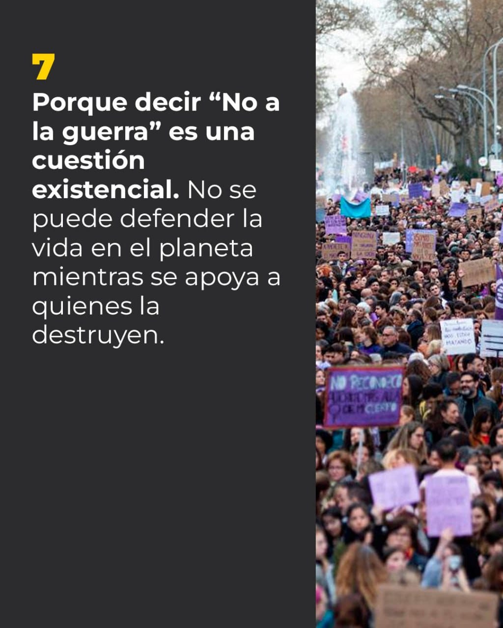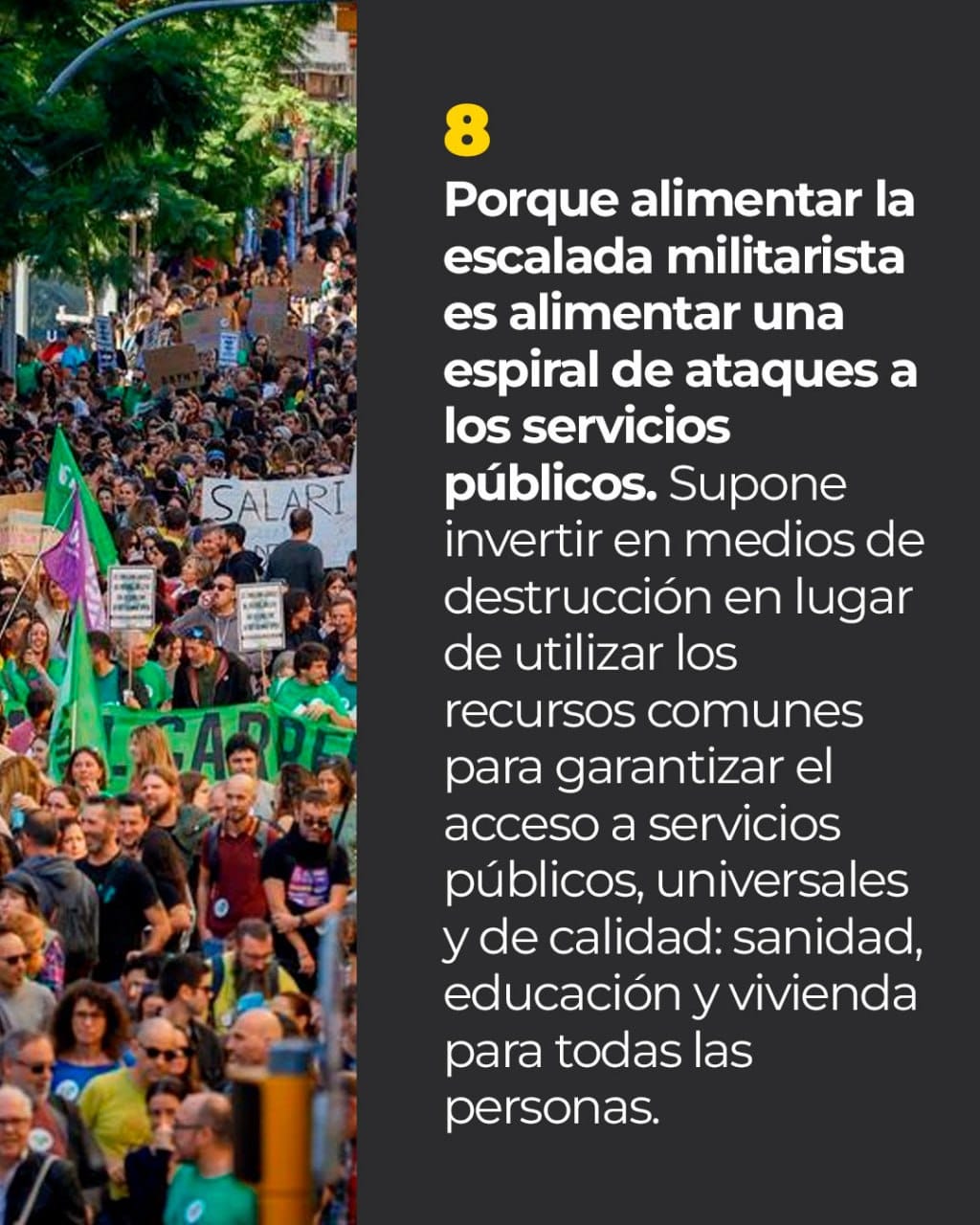 La convocatoria se produce en un contexto de escalada bélica en Oriente Medio, con la guerra iniciada por Estados Unidos e Israel contra Irán cumpliendo su cuarta semana, y mientras los gobiernos europeos, incluido el español, incrementan el gasto militar en respuesta a las presiones de la OTAN. Los manifestantes denunciaron tanto la agresión contra Irán como el papel de la Unión Europea en la guerra, así como el aumento de los presupuestos militares en el Estado español y otros países del continente. La organización subrayó que las guerras imperialistas “agreden a cada vez más pueblos y avanzan sin control” y reclamó “más solidaridad, más movilización” para frenar “esta escalada militarista que nos lleva al desastre”.