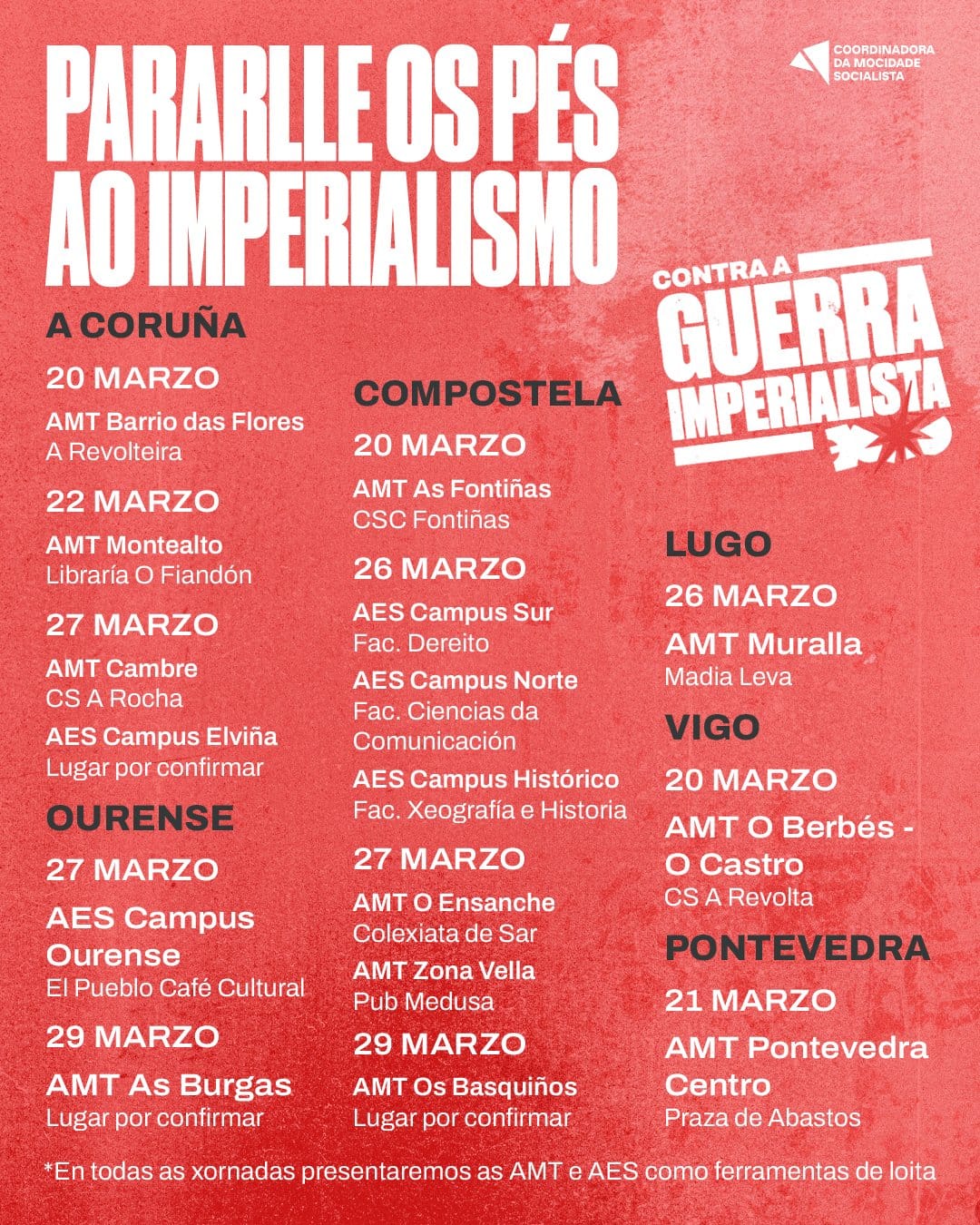 Además del despliegue organizativo de sus AMT y AES, la CMS ha programado para los próximos días 16 actos en distintos puntos de Galiza bajo el lema Parémoslle os pés ao imperialismo (Parémosle los pies al imperialismo). Las actividades se están desarrollando en centros sociales, librerías, centros culturales y facultades entre el 20 y el 29 de marzo, según el calendario difundido. En cada jornada se presentan además las propias asambleas como herramientas de organización y lucha. Entre los lugares destacan el CSC Fontiñas en Santiago, la librería O Fiandón en A Coruña, el CS A Revolta en Vigo, la Facultad de Derecho del Campus Sur en Compostela y la Praza de Abastos en Pontevedra, entre otros.