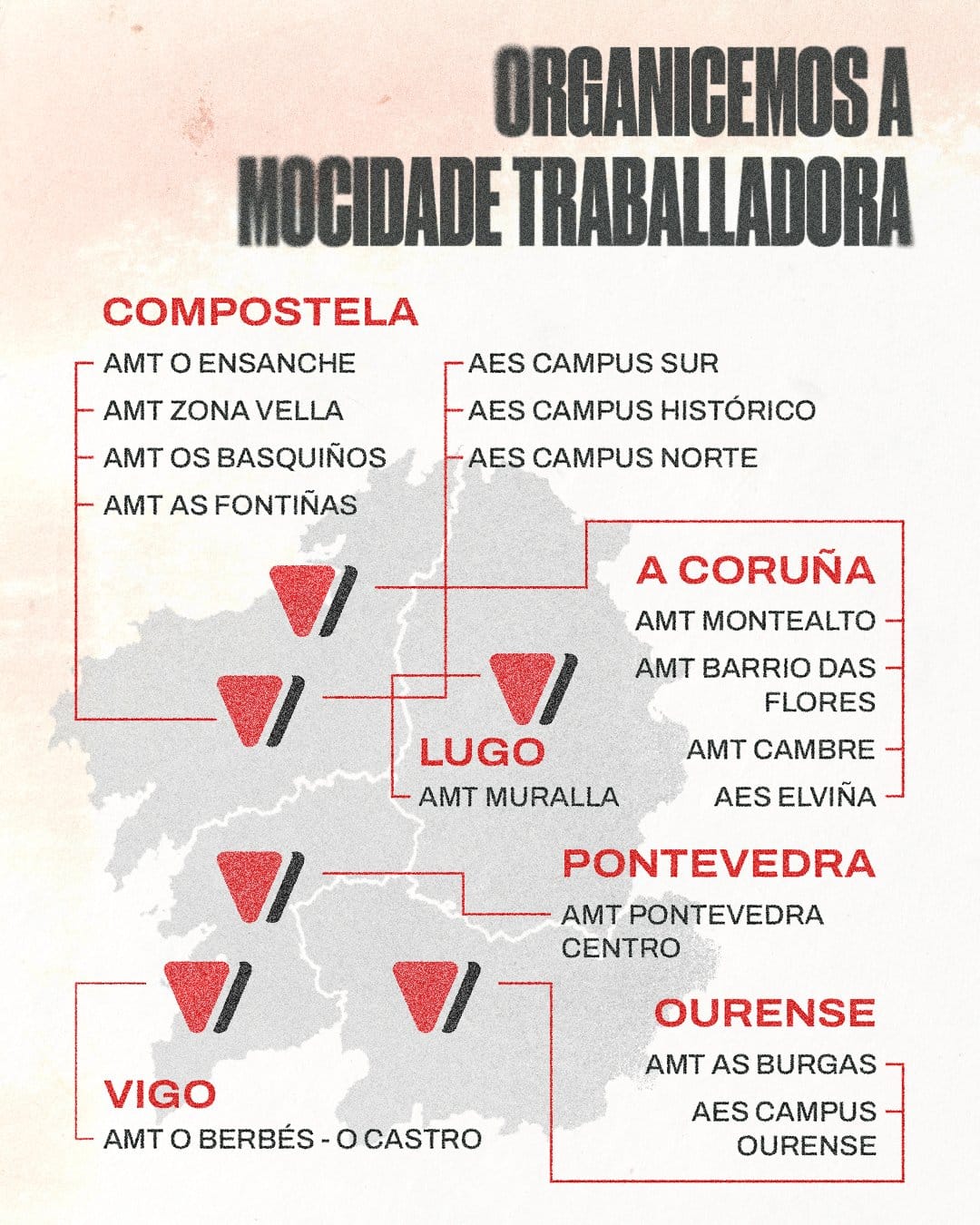 La Coordinadora da Mocidade Socialista (CMS) presenytó a mediados de marzo las Asembleas da Mocidade Traballadora (AMT) y las Asembleas de Estudantes Socialistas (AES) en A Coruña, Santiago, Lugo, Pontevedra, Vigo, Ourense y Ferrol, según difundió la propia organización en sus redes sociales. Las asambleas se configuran como “espacios de base” que trabajarán en barrios y centros de enseñanza con el objetivo de “devolver a los barrios y centros de enseñanza las redes militantes estables, la organización política y la lucha revolucionaria”. En un comunicado, la CMS subrayaba que el momento actual evidencia “cómo la burguesía está incrementando el ataque contra la clase trabajadora del mundo, un momento en el que la guerra imperialista, las masacres y el fascismo amenazan con volver a convertirse en norma”.