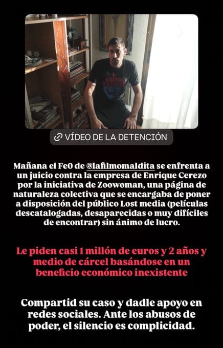 A través de sus redes sociales, La Filmoteca Maldita ha alertado de que el juicio se celebra este 9 de abril tras un largo periodo de instrucción en el que se le imputa un "delito contra la propiedad intelectual". El encausado ha solicitado el apoyo ante la persecución judicial por parte de las estructuras empresariales de Cerezo. Subraya que la plataforma no generaba ingresos y que su función era estrictamente la de preservación de un patrimonio fílmico que, de otro modo, quedaría condenado a la desaparición por el abandono institucional y la lógica de la exclusividad privada.