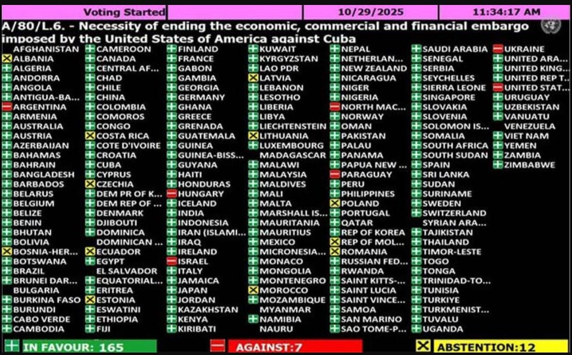 El actual Gobierno de Ucrania, presidido por Volodimir Zelensky, mantiene una política exterior alineándose con los intereses de EEUU en las Naciones Unidas, dificultando el consenso internacional contra el bloqueo a Cuba. Esta postura de Kiev supone una ruptura con la trayectoria histórica del país, que durante décadas votó de forma sistemática a favor de las resoluciones que exigen el fin de las sanciones económicas estadounidenses. Este distanciamiento político se produce a pesar de que Cuba fue el país que sostuvo el programa de salud más ambicioso y prolongado para las víctimas ucranianas de la catástrofe de Chernóbil en medio de una situación interna complicadísima, una labor que el Estado cubano financió íntegramente incluso en sus años de crisis económica.