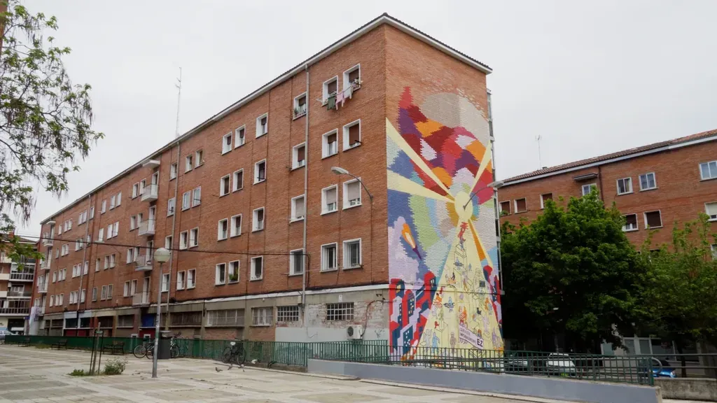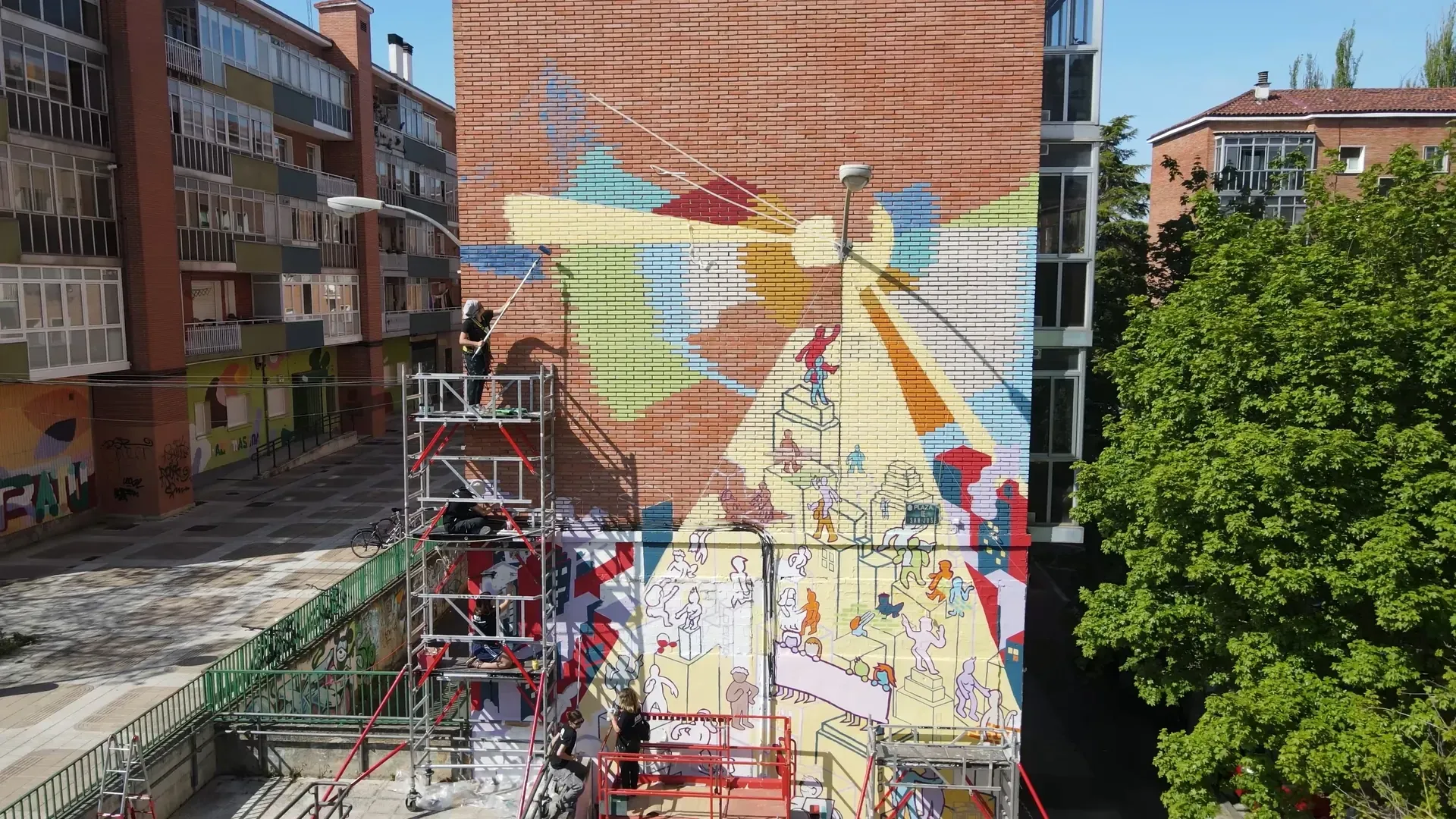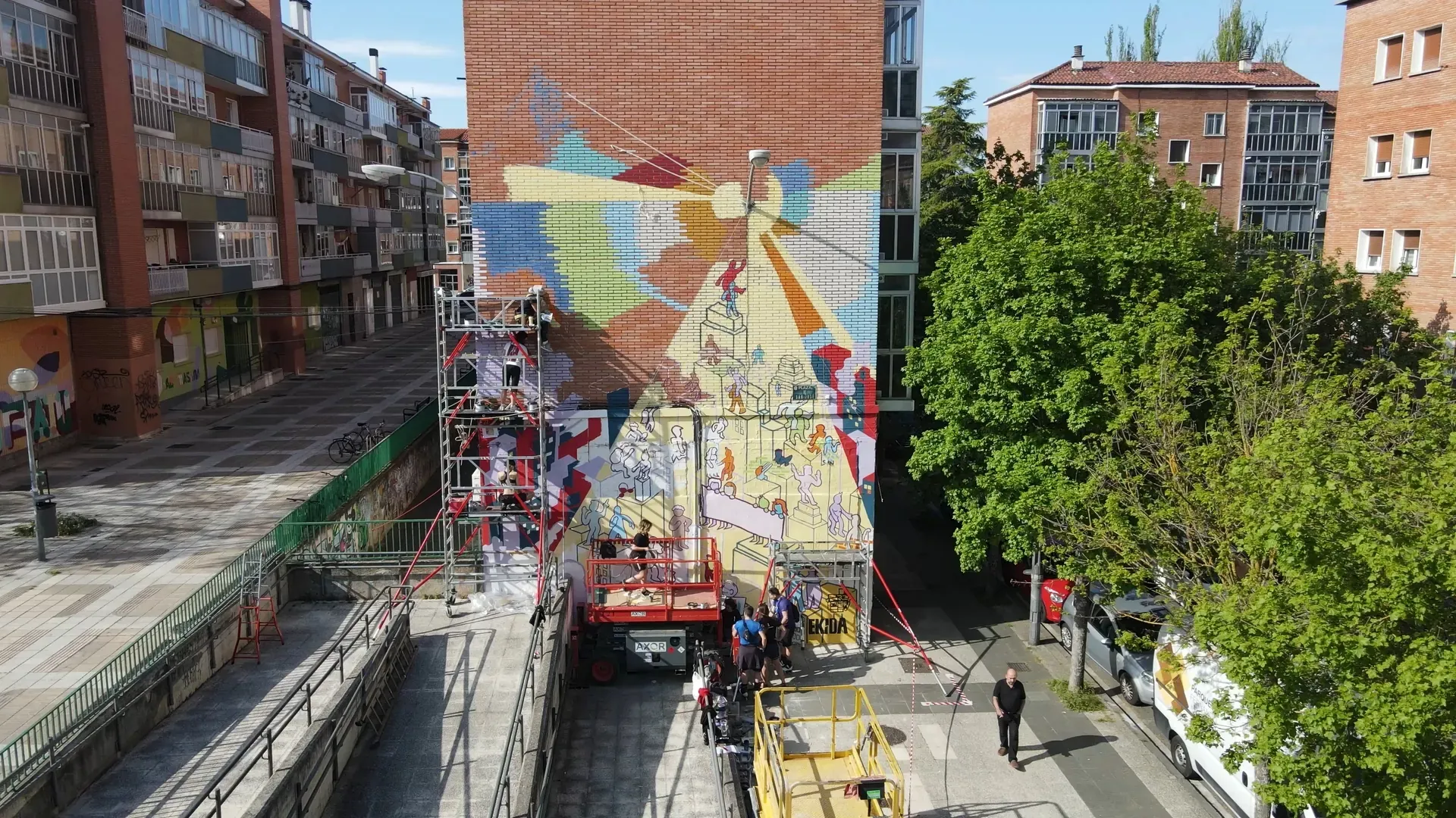 La Iniciativa Artística Socialista Ekida ha realizado un nuevo mural en el barrio de Arana de Vitoria-Gasteiz (Araba). Se trata de una imagen colorida sobre una pared de dieciocho metros, junto a la Plaza San José, en el número 21 de la calle Extremadura. La iniciativa la han llevado a cabo junto con la Asociación de Vecinos de Arana. Vecinos y quienes han pasado por la zona en los últimos días han visto trabajar a los miembros de Ekida desde principios de abril; han utilizado andamios y grúas y han ido componiendo el gran mural día a día. La semana pasada finalizaron el trabajo y el sábado lo presentaron al público.