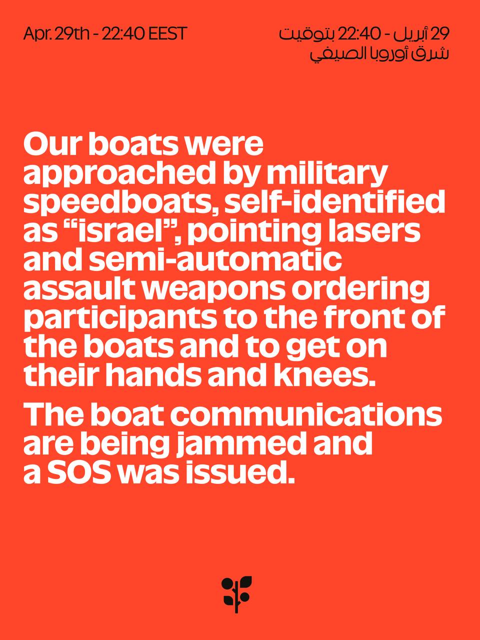 Desde la Flotilla han denunciado que los militares israelíes han saboteado los sistemas de transmisión de las naves para impedir que se difundan imágenes de la interceptación. La organización ha denunciado que "las comunicaciones de los barcos están siendo interferidas", una táctica habitual para ocultar las actuaciones de las fuerzas israelíes en alta mar. Ante la situación de peligro físico para los voluntarios, la flotilla ha emitido una señal de socorro (SOS) internacional.